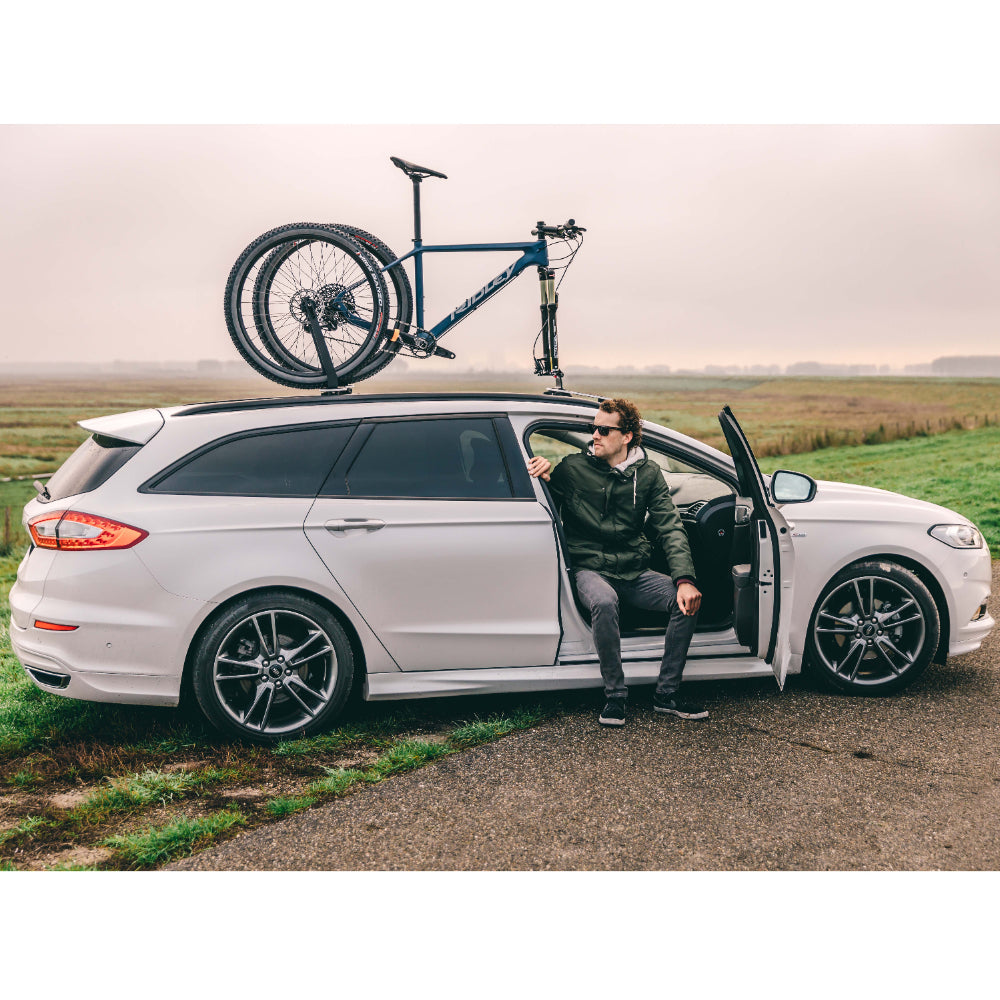 Je zet de fiets op de SeaSucker dakdrager, je zet de voorvork vast zoals je normaal gesproken je voorwiel vastzet en je zet het achterwiel vast met de los meegeleverde cup. Even controleren of alles goed vast zit en je kan vertrekken!