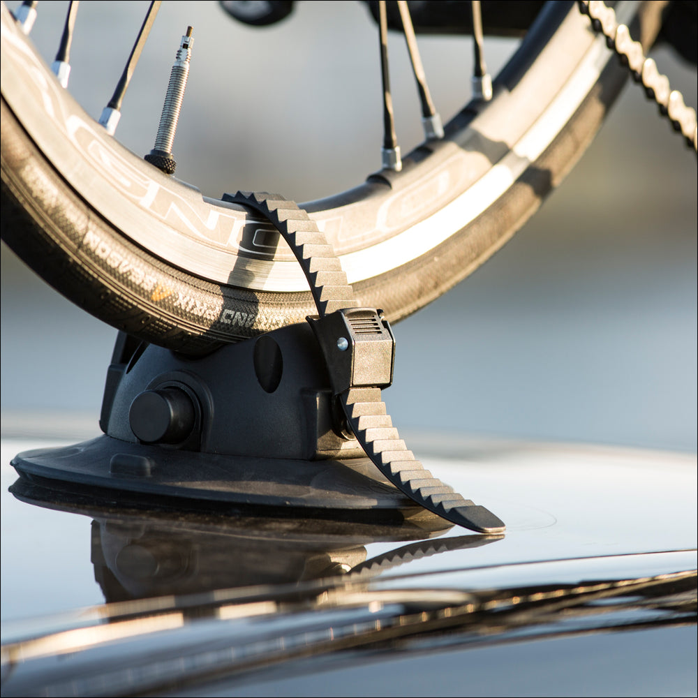 Je zet de fiets op de SeaSucker dakdrager, je zet de voorvork vast zoals je normaal gesproken je voorwiel vastzet en je zet het achterwiel vast met de los meegeleverde cup. Even controleren of alles goed vast zit en je kan vertrekken!